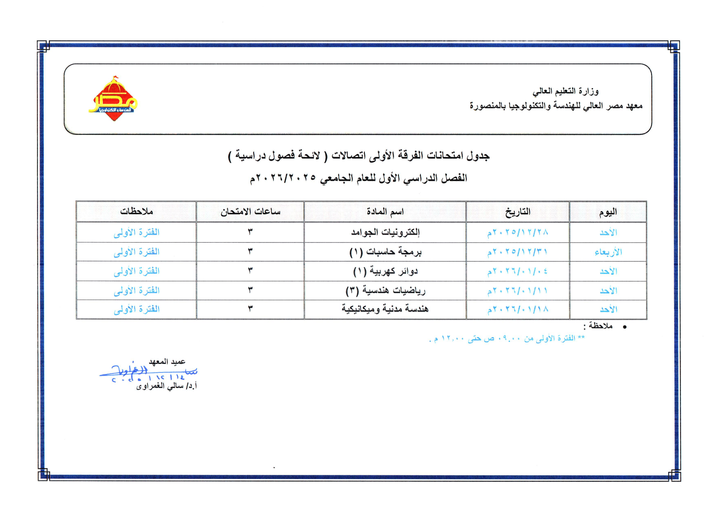 جداول امتحانات نهاية - الفصل الدراسي الاول 2025 / 2026